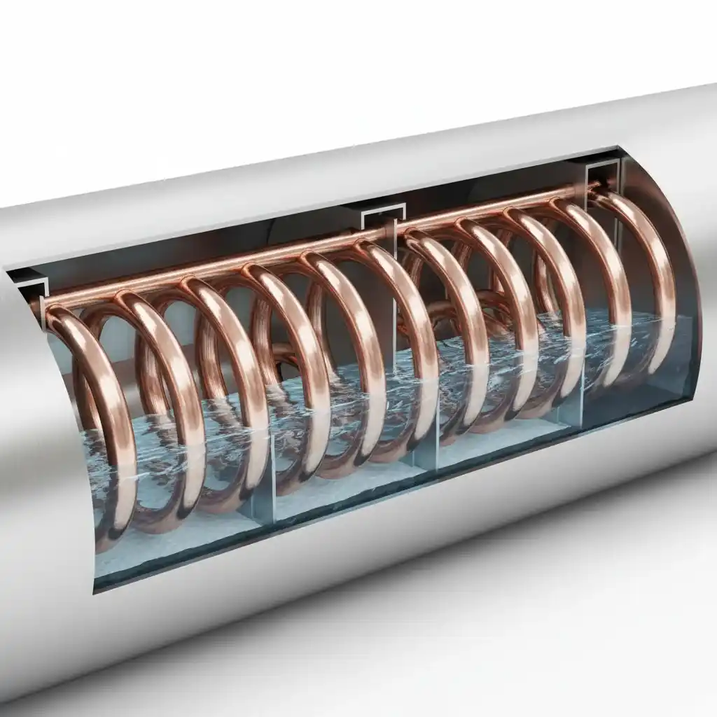 این نوع منبع با استفاده از کویل مسی داخلی و تبادل حرارتی غیرمستقیم، آب گرم بهداشتی را با راندمان بالا، ایمن و پایدار تأمین می‌کند.