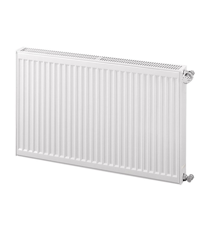 ساختار پنل: این رادیاتور دو پنل و دو کانوکتور دارد (دوکنوکتور) – طراحیای کلاسیک در رادیاتورهای پنلی که بازده حرارتی را افزایش میدهد.